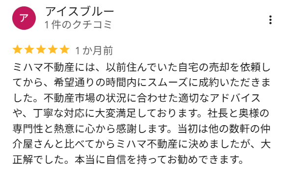 私は今回家を売却するにあたり、何件かの不動産会社を回りましたが、ミハマ様にお会いでき、話をさせていただきましたところ、とても親身に話を聞いていただき、とても信頼できる方だと思いお願いすることに決めました。