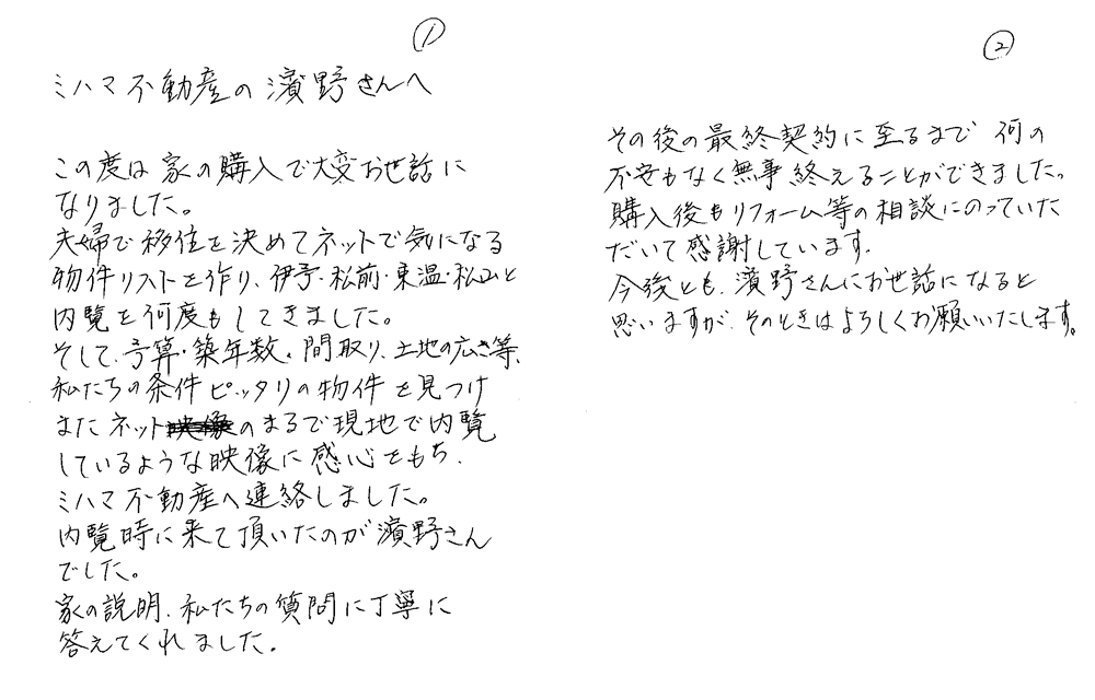 20年程前、母の知人から松山の土地を買って欲しいとのお願いがあり、娘の私が購入しましたが、○○市在住ということもあり、近年どなたかに購入していただけないかと考えておりました所、ミハマ様からお声かけいただき、大変よろこんでおりました。